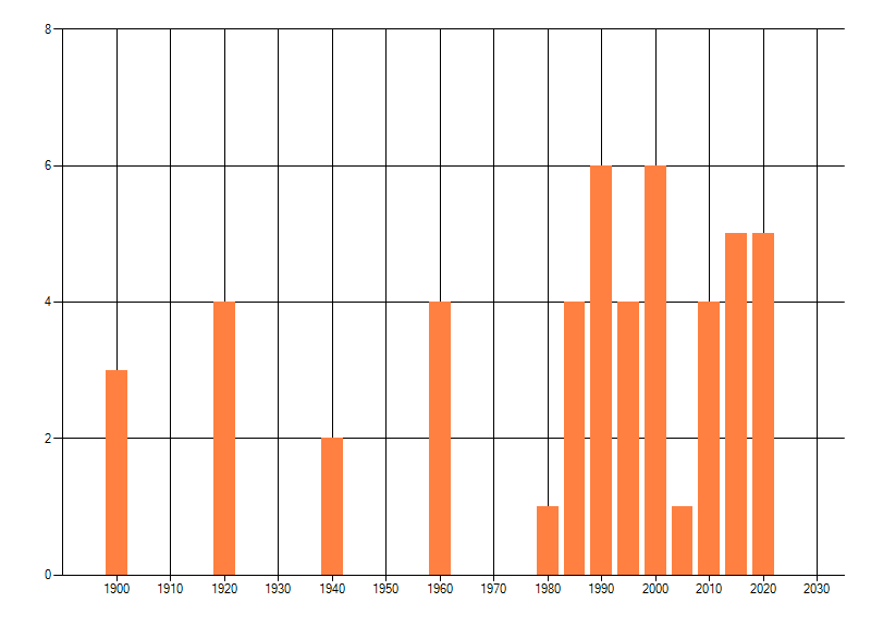 Het aantal atlasblokken (5x5 km) waarin de soort is gemeld binnen een periode van vijf jaar (vanaf 1980) of twintig jaar. Niet gecorrigeerd voor waarnemersinspanning en het aantal doorgegeven waarnemingen kan sterk variëren per periode, dus een trend in verspreiding kan hier niet direct uit worden afgelezen. Het opgegeven jaartal is het eerste jaar van de periode. Bron: gevalideerde waarnemingen uit de NDFF.