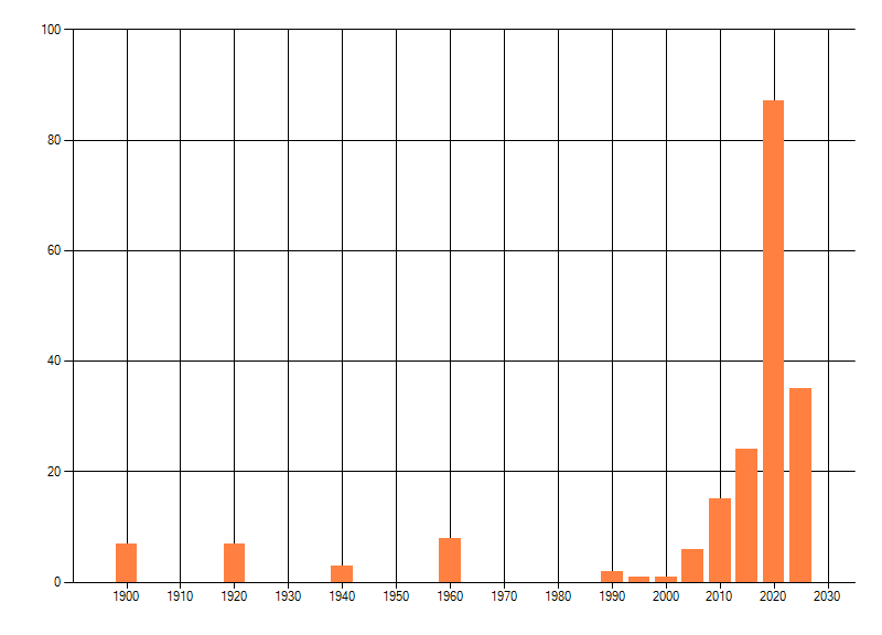 Het aantal atlasblokken (5x5 km) waarin de soort is gemeld binnen een periode van vijf jaar (vanaf 1980) of twintig jaar. Niet gecorrigeerd voor waarnemersinspanning en het aantal doorgegeven waarnemingen kan sterk variëren per periode, dus een trend in verspreiding kan hier niet direct uit worden afgelezen. Het opgegeven jaartal is het eerste jaar van de periode. Bron: gevalideerde waarnemingen uit de NDFF.