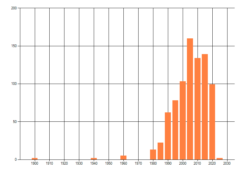 Het aantal atlasblokken (5x5 km) waarin de soort is gemeld binnen een periode van vijf jaar (vanaf 1980) of twintig jaar. Niet gecorrigeerd voor waarnemersinspanning en het aantal doorgegeven waarnemingen kan sterk variëren per periode, dus een trend in verspreiding kan hier niet direct uit worden afgelezen. Het opgegeven jaartal is het eerste jaar van de periode. Bron: gevalideerde waarnemingen uit de NDFF.