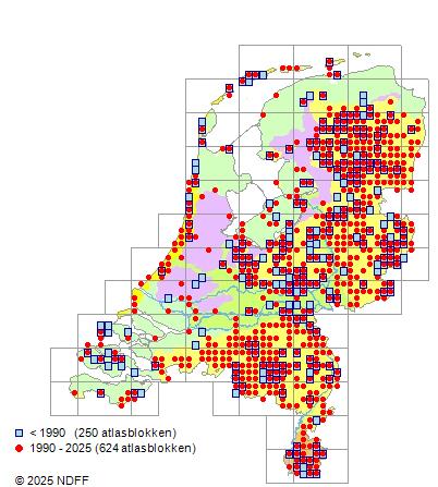 Het aantal atlasblokken (5x5 km) waarin de soort is gemeld binnen een periode van vijf jaar (vanaf 1980) of twintig jaar. Niet gecorrigeerd voor waarnemersinspanning en het aantal doorgegeven waarnemingen kan sterk variëren per periode, dus een trend in verspreiding kan hier niet direct uit worden afgelezen. Het opgegeven jaartal is het eerste jaar van de periode. Bron: gevalideerde waarnemingen uit de NDFF.