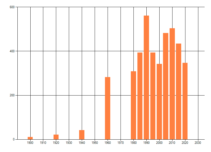 Het aantal atlasblokken (5x5 km) waarin de soort is gemeld binnen een periode van vijf jaar (vanaf 1980) of twintig jaar. Niet gecorrigeerd voor waarnemersinspanning en het aantal doorgegeven waarnemingen kan sterk variëren per periode, dus een trend in verspreiding kan hier niet direct uit worden afgelezen. Het opgegeven jaartal is het eerste jaar van de periode. Bron: gevalideerde waarnemingen uit de NDFF.