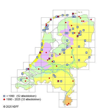Het aantal atlasblokken (5x5 km) waarin de soort is gemeld binnen een periode van vijf jaar (vanaf 1980) of twintig jaar. Niet gecorrigeerd voor waarnemersinspanning en het aantal doorgegeven waarnemingen kan sterk variëren per periode, dus een trend in verspreiding kan hier niet direct uit worden afgelezen. Het opgegeven jaartal is het eerste jaar van de periode. Bron: gevalideerde waarnemingen uit de NDFF.