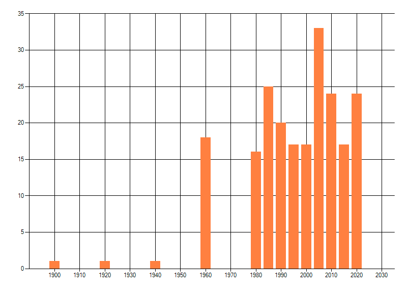 Het aantal atlasblokken (5x5 km) waarin de soort is gemeld binnen een periode van vijf jaar (vanaf 1980) of twintig jaar. Niet gecorrigeerd voor waarnemersinspanning en het aantal doorgegeven waarnemingen kan sterk variëren per periode, dus een trend in verspreiding kan hier niet direct uit worden afgelezen. Het opgegeven jaartal is het eerste jaar van de periode. Bron: gevalideerde waarnemingen uit de NDFF.