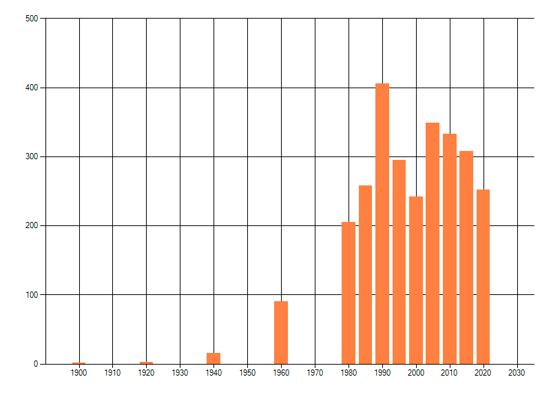 Het aantal atlasblokken (5x5 km) waarin de soort is gemeld binnen een periode van vijf jaar (vanaf 1980) of twintig jaar. Niet gecorrigeerd voor waarnemersinspanning en het aantal doorgegeven waarnemingen kan sterk variëren per periode, dus een trend in verspreiding kan hier niet direct uit worden afgelezen. Het opgegeven jaartal is het eerste jaar van de periode. Bron: gevalideerde waarnemingen uit de NDFF.