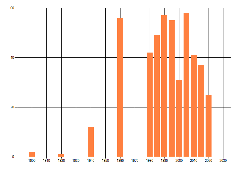 Het aantal atlasblokken (5x5 km) waarin de soort is gemeld binnen een periode van vijf jaar (vanaf 1980) of twintig jaar. Niet gecorrigeerd voor waarnemersinspanning en het aantal doorgegeven waarnemingen kan sterk variëren per periode, dus een trend in verspreiding kan hier niet direct uit worden afgelezen. Het opgegeven jaartal is het eerste jaar van de periode. Bron: gevalideerde waarnemingen uit de NDFF.