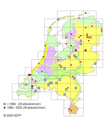 Het aantal atlasblokken (5x5 km) waarin de soort is gemeld binnen een periode van vijf jaar (vanaf 1980) of twintig jaar. Niet gecorrigeerd voor waarnemersinspanning en het aantal doorgegeven waarnemingen kan sterk variëren per periode, dus een trend in verspreiding kan hier niet direct uit worden afgelezen. Het opgegeven jaartal is het eerste jaar van de periode. Bron: gevalideerde waarnemingen uit de NDFF.