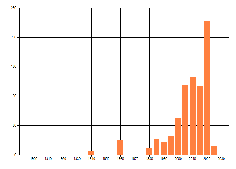 Het aantal atlasblokken (5x5 km) waarin de soort is gemeld binnen een periode van vijf jaar (vanaf 1980) of twintig jaar. Niet gecorrigeerd voor waarnemersinspanning en het aantal doorgegeven waarnemingen kan sterk variëren per periode, dus een trend in verspreiding kan hier niet direct uit worden afgelezen. Het opgegeven jaartal is het eerste jaar van de periode. Bron: gevalideerde waarnemingen uit de NDFF.