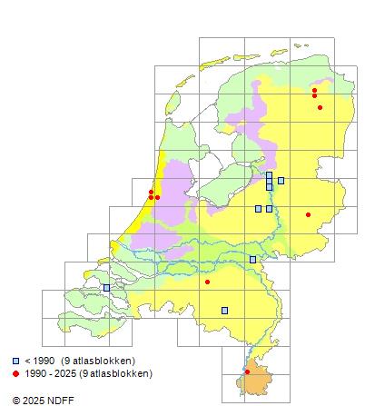Het aantal atlasblokken (5x5 km) waarin de soort is gemeld binnen een periode van vijf jaar (vanaf 1980) of twintig jaar. Niet gecorrigeerd voor waarnemersinspanning en het aantal doorgegeven waarnemingen kan sterk variëren per periode, dus een trend in verspreiding kan hier niet direct uit worden afgelezen. Het opgegeven jaartal is het eerste jaar van de periode. Bron: gevalideerde waarnemingen uit de NDFF.