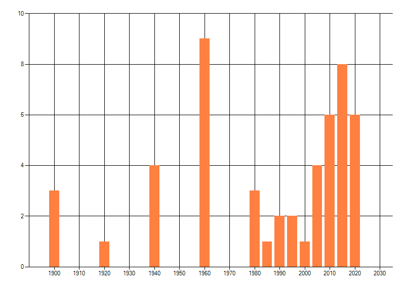 Het aantal atlasblokken (5x5 km) waarin de soort is gemeld binnen een periode van vijf jaar (vanaf 1980) of twintig jaar. Niet gecorrigeerd voor waarnemersinspanning en het aantal doorgegeven waarnemingen kan sterk variëren per periode, dus een trend in verspreiding kan hier niet direct uit worden afgelezen. Het opgegeven jaartal is het eerste jaar van de periode. Bron: gevalideerde waarnemingen uit de NDFF.