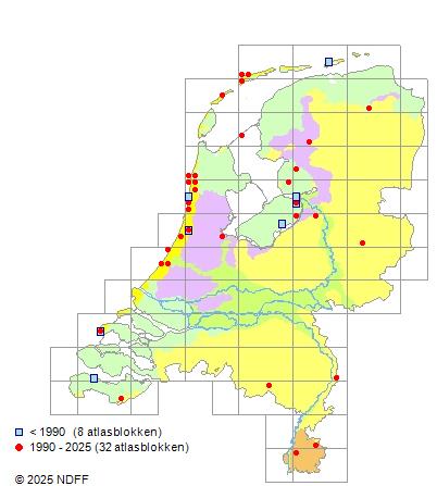 Het aantal atlasblokken (5x5 km) waarin de soort is gemeld binnen een periode van vijf jaar (vanaf 1980) of twintig jaar. Niet gecorrigeerd voor waarnemersinspanning en het aantal doorgegeven waarnemingen kan sterk variëren per periode, dus een trend in verspreiding kan hier niet direct uit worden afgelezen. Het opgegeven jaartal is het eerste jaar van de periode. Bron: gevalideerde waarnemingen uit de NDFF.