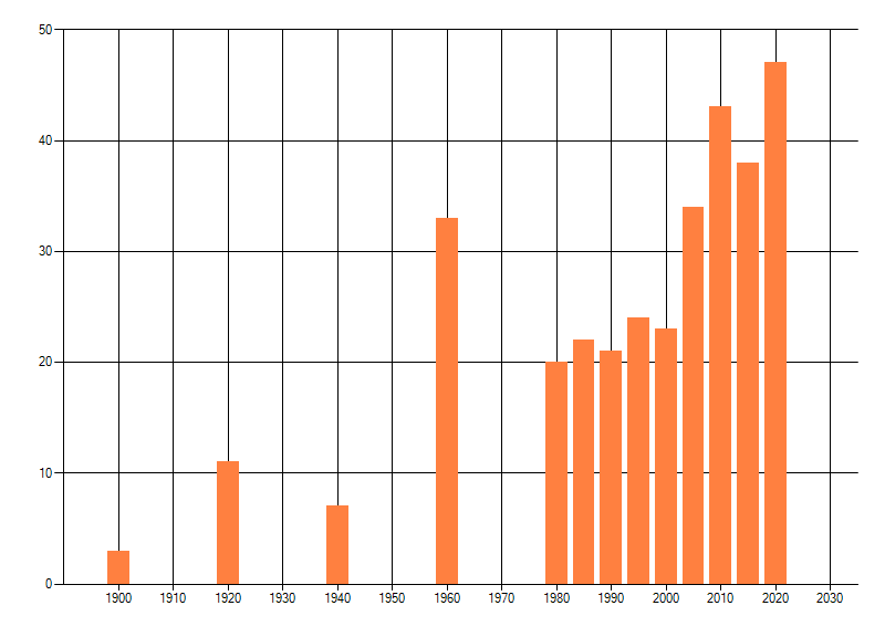 Het aantal atlasblokken (5x5 km) waarin de soort is gemeld binnen een periode van vijf jaar (vanaf 1980) of twintig jaar. Niet gecorrigeerd voor waarnemersinspanning en het aantal doorgegeven waarnemingen kan sterk variëren per periode, dus een trend in verspreiding kan hier niet direct uit worden afgelezen. Het opgegeven jaartal is het eerste jaar van de periode. Bron: gevalideerde waarnemingen uit de NDFF.