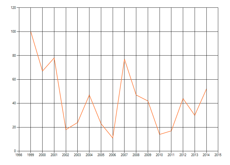 Trend in het geschatte aantal individuen van paddenstoelen in bossen op de hoge zandgronden, weergegeven als indexcijfer (eerste jaar = 100). Bron: