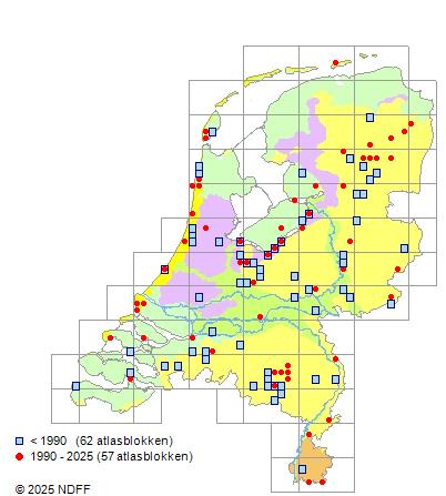 Het aantal atlasblokken (5x5 km) waarin de soort is gemeld binnen een periode van vijf jaar (vanaf 1980) of twintig jaar. Niet gecorrigeerd voor waarnemersinspanning en het aantal doorgegeven waarnemingen kan sterk variëren per periode, dus een trend in verspreiding kan hier niet direct uit worden afgelezen. Het opgegeven jaartal is het eerste jaar van de periode. Bron: gevalideerde waarnemingen uit de NDFF.