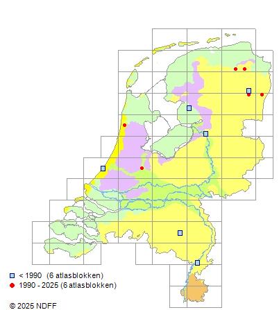 Het aantal atlasblokken (5x5 km) waarin de soort is gemeld binnen een periode van vijf jaar (vanaf 1980) of twintig jaar. Niet gecorrigeerd voor waarnemersinspanning en het aantal doorgegeven waarnemingen kan sterk variëren per periode, dus een trend in verspreiding kan hier niet direct uit worden afgelezen. Het opgegeven jaartal is het eerste jaar van de periode. Bron: gevalideerde waarnemingen uit de NDFF.