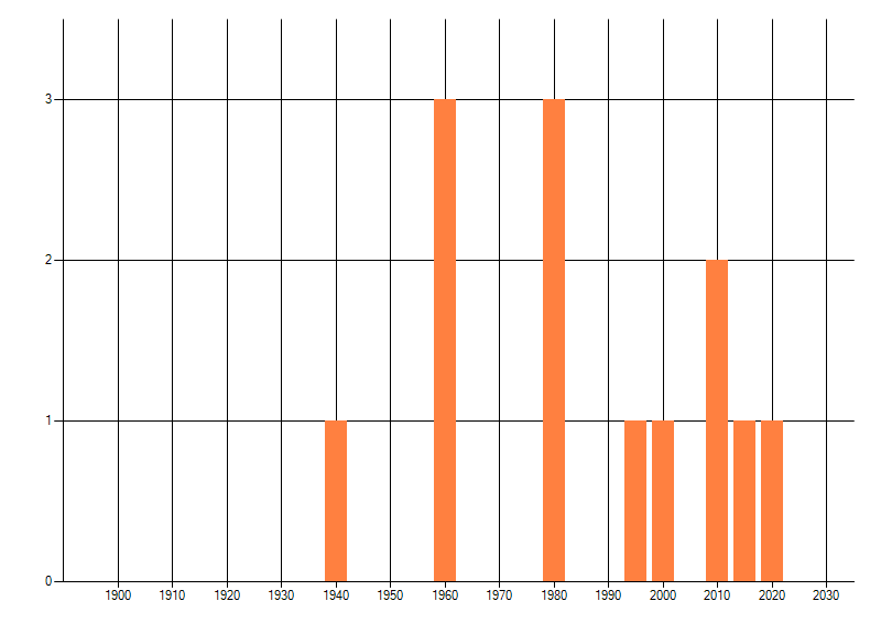 Het aantal atlasblokken (5x5 km) waarin de soort is gemeld binnen een periode van vijf jaar (vanaf 1980) of twintig jaar. Niet gecorrigeerd voor waarnemersinspanning en het aantal doorgegeven waarnemingen kan sterk variëren per periode, dus een trend in verspreiding kan hier niet direct uit worden afgelezen. Het opgegeven jaartal is het eerste jaar van de periode. Bron: gevalideerde waarnemingen uit de NDFF.