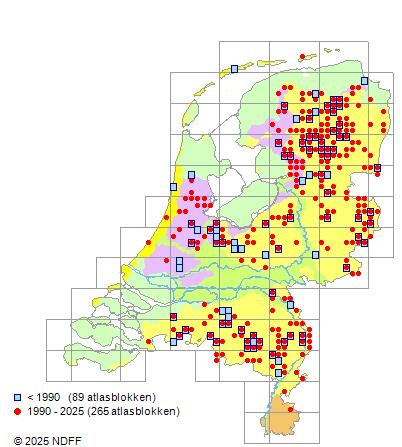Het aantal atlasblokken (5x5 km) waarin de soort is gemeld binnen een periode van vijf jaar (vanaf 1980) of twintig jaar. Niet gecorrigeerd voor waarnemersinspanning en het aantal doorgegeven waarnemingen kan sterk variëren per periode, dus een trend in verspreiding kan hier niet direct uit worden afgelezen. Het opgegeven jaartal is het eerste jaar van de periode. Bron: gevalideerde waarnemingen uit de NDFF.