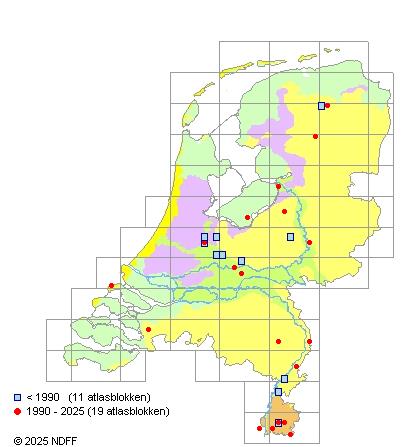 Zeld., vooral in F, zeer zeld. in D, G en Z. Sterk afgenomen, na 1986 nog slechts van twee plaatsen gemeld.