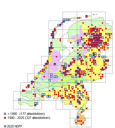 Het aantal atlasblokken (5x5 km) waarin de soort is gemeld binnen een periode van vijf jaar (vanaf 1980) of twintig jaar. Niet gecorrigeerd voor waarnemersinspanning en het aantal doorgegeven waarnemingen kan sterk variëren per periode, dus een trend in verspreiding kan hier niet direct uit worden afgelezen. Het opgegeven jaartal is het eerste jaar van de periode. Bron: gevalideerde waarnemingen uit de NDFF.
