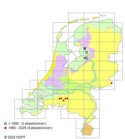 Het aantal atlasblokken (5x5 km) waarin de soort is gemeld binnen een periode van vijf jaar (vanaf 1980) of twintig jaar. Niet gecorrigeerd voor waarnemersinspanning en het aantal doorgegeven waarnemingen kan sterk variëren per periode, dus een trend in verspreiding kan hier niet direct uit worden afgelezen. Het opgegeven jaartal is het eerste jaar van de periode. Bron: gevalideerde waarnemingen uit de NDFF.