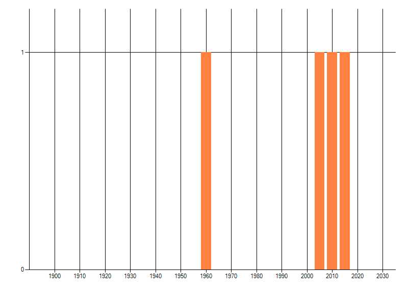 Het aantal atlasblokken (5x5 km) waarin de soort is gemeld binnen een periode van vijf jaar (vanaf 1980) of twintig jaar. Niet gecorrigeerd voor waarnemersinspanning en het aantal doorgegeven waarnemingen kan sterk variëren per periode, dus een trend in verspreiding kan hier niet direct uit worden afgelezen. Het opgegeven jaartal is het eerste jaar van de periode. Bron: gevalideerde waarnemingen uit de NDFF.