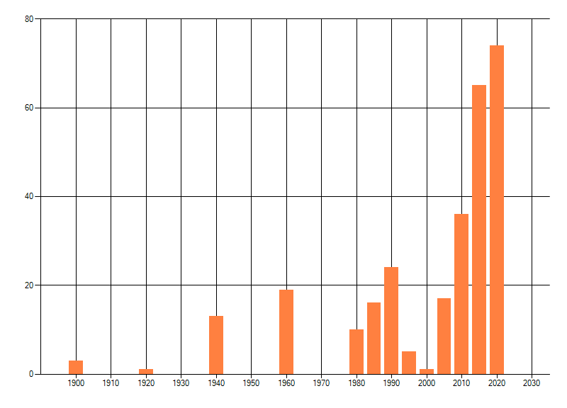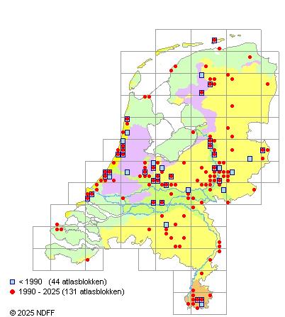 Het aantal atlasblokken (5x5 km) waarin de soort is gemeld binnen een periode van vijf jaar (vanaf 1980) of twintig jaar. Niet gecorrigeerd voor waarnemersinspanning en het aantal doorgegeven waarnemingen kan sterk variëren per periode, dus een trend in verspreiding kan hier niet direct uit worden afgelezen. Het opgegeven jaartal is het eerste jaar van de periode. Bron: gevalideerde waarnemingen uit de NDFF.