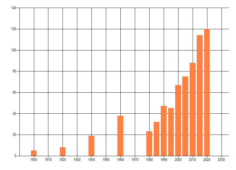 Het aantal atlasblokken (5x5 km) waarin de soort is gemeld binnen een periode van vijf jaar (vanaf 1980) of twintig jaar. Niet gecorrigeerd voor waarnemersinspanning en het aantal doorgegeven waarnemingen kan sterk variëren per periode, dus een trend in verspreiding kan hier niet direct uit worden afgelezen. Het opgegeven jaartal is het eerste jaar van de periode. Bron: gevalideerde waarnemingen uit de NDFF.
