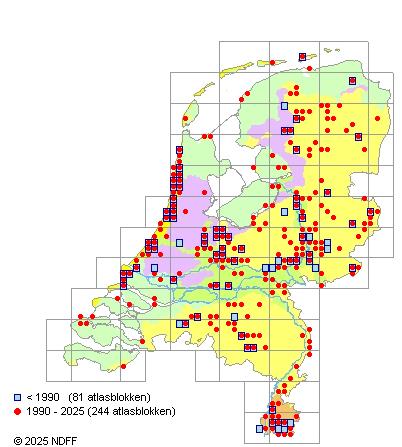 Volgens bestand NMV vroeger matig alg. (waarschijnlijk vrij alg.); afnemend en thans vrij zeld. Voornamelijk in R, F en Z; zeld. in P, W en H. Kaart in Nauta & Vellinga, Atlas. 1995.