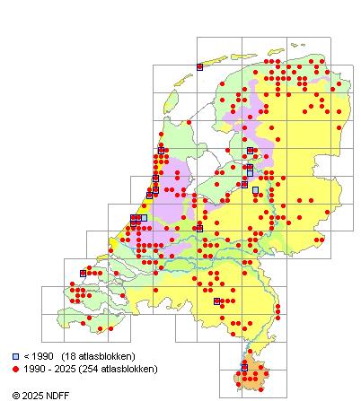 Het aantal atlasblokken (5x5 km) waarin de soort is gemeld binnen een periode van vijf jaar (vanaf 1980) of twintig jaar. Niet gecorrigeerd voor waarnemersinspanning en het aantal doorgegeven waarnemingen kan sterk variëren per periode, dus een trend in verspreiding kan hier niet direct uit worden afgelezen. Het opgegeven jaartal is het eerste jaar van de periode. Bron: gevalideerde waarnemingen uit de NDFF.