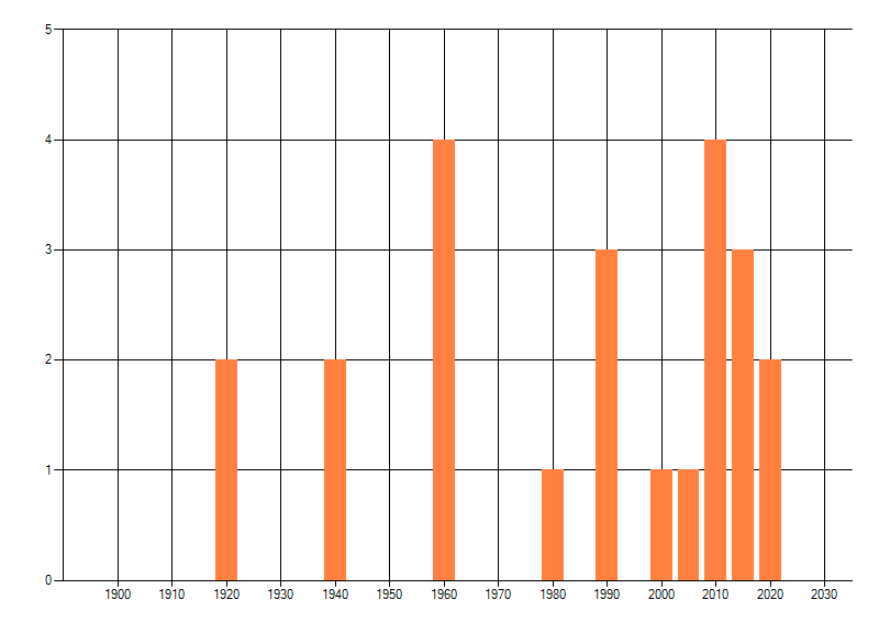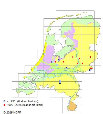 Het aantal atlasblokken (5x5 km) waarin de soort is gemeld binnen een periode van vijf jaar (vanaf 1980) of twintig jaar. Niet gecorrigeerd voor waarnemersinspanning en het aantal doorgegeven waarnemingen kan sterk variëren per periode, dus een trend in verspreiding kan hier niet direct uit worden afgelezen. Het opgegeven jaartal is het eerste jaar van de periode. Bron: gevalideerde waarnemingen uit de NDFF.