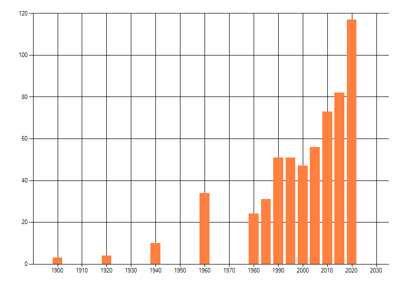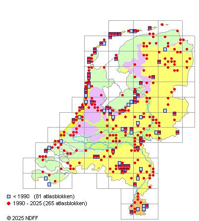 Het aantal atlasblokken (5x5 km) waarin de soort is gemeld binnen een periode van vijf jaar (vanaf 1980) of twintig jaar. Niet gecorrigeerd voor waarnemersinspanning en het aantal doorgegeven waarnemingen kan sterk variëren per periode, dus een trend in verspreiding kan hier niet direct uit worden afgelezen. Het opgegeven jaartal is het eerste jaar van de periode. Bron: gevalideerde waarnemingen uit de NDFF.