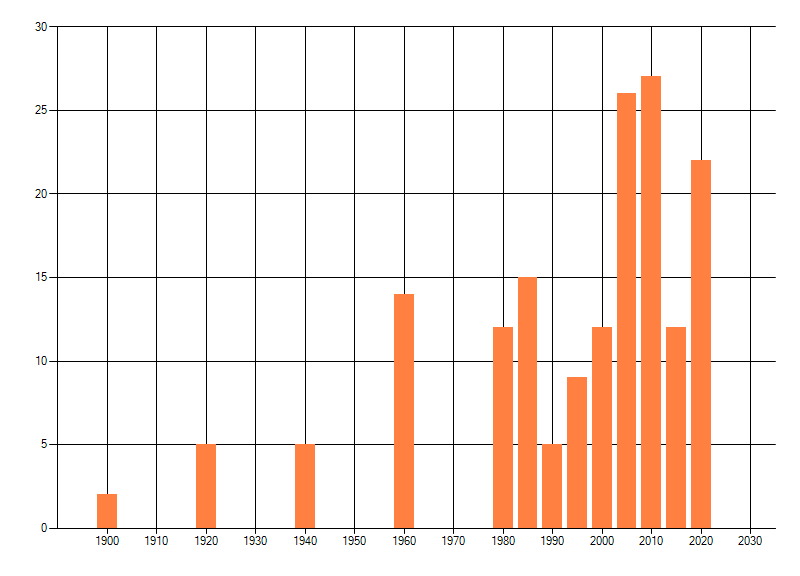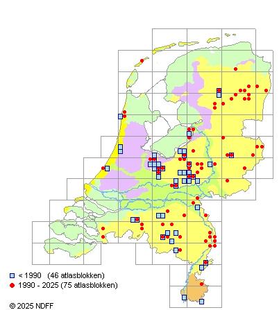 Het aantal atlasblokken (5x5 km) waarin de soort is gemeld binnen een periode van vijf jaar (vanaf 1980) of twintig jaar. Niet gecorrigeerd voor waarnemersinspanning en het aantal doorgegeven waarnemingen kan sterk variëren per periode, dus een trend in verspreiding kan hier niet direct uit worden afgelezen. Het opgegeven jaartal is het eerste jaar van de periode. Bron: gevalideerde waarnemingen uit de NDFF.