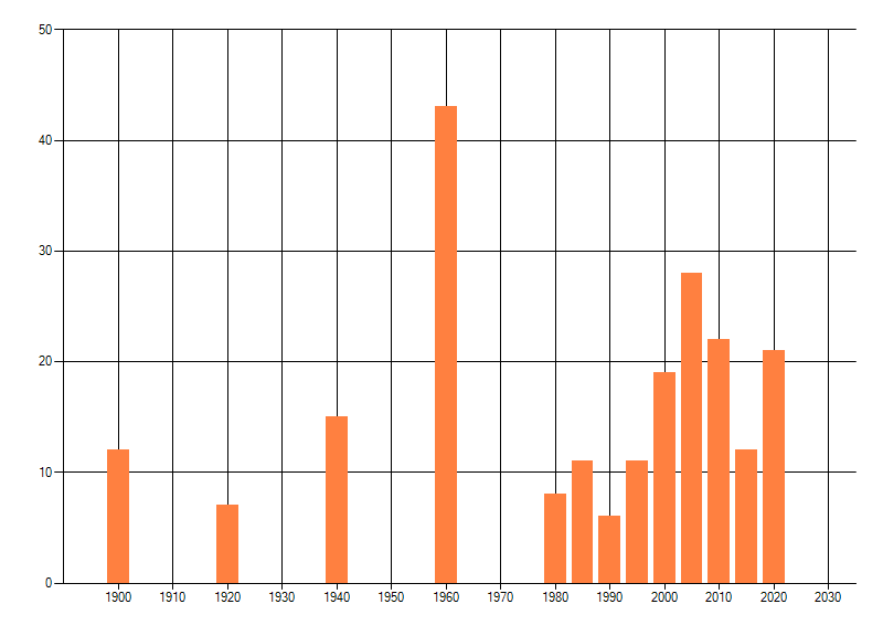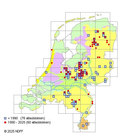 Het aantal atlasblokken (5x5 km) waarin de soort is gemeld binnen een periode van vijf jaar (vanaf 1980) of twintig jaar. Niet gecorrigeerd voor waarnemersinspanning en het aantal doorgegeven waarnemingen kan sterk variëren per periode, dus een trend in verspreiding kan hier niet direct uit worden afgelezen. Het opgegeven jaartal is het eerste jaar van de periode. Bron: gevalideerde waarnemingen uit de NDFF.