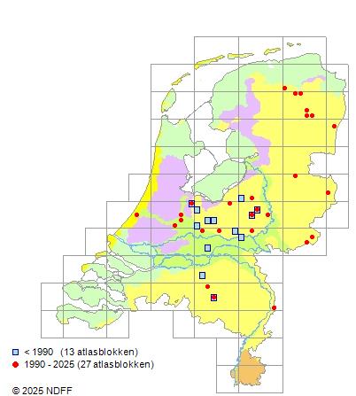 Het aantal atlasblokken (5x5 km) waarin de soort is gemeld binnen een periode van vijf jaar (vanaf 1980) of twintig jaar. Niet gecorrigeerd voor waarnemersinspanning en het aantal doorgegeven waarnemingen kan sterk variëren per periode, dus een trend in verspreiding kan hier niet direct uit worden afgelezen. Het opgegeven jaartal is het eerste jaar van de periode. Bron: gevalideerde waarnemingen uit de NDFF.
