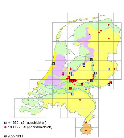 Het aantal atlasblokken (5x5 km) waarin de soort is gemeld binnen een periode van vijf jaar (vanaf 1980) of twintig jaar. Niet gecorrigeerd voor waarnemersinspanning en het aantal doorgegeven waarnemingen kan sterk variëren per periode, dus een trend in verspreiding kan hier niet direct uit worden afgelezen. Het opgegeven jaartal is het eerste jaar van de periode. Bron: gevalideerde waarnemingen uit de NDFF.