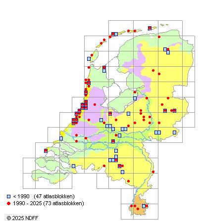 Het aantal atlasblokken (5x5 km) waarin de soort is gemeld binnen een periode van vijf jaar (vanaf 1980) of twintig jaar. Niet gecorrigeerd voor waarnemersinspanning en het aantal doorgegeven waarnemingen kan sterk variëren per periode, dus een trend in verspreiding kan hier niet direct uit worden afgelezen. Het opgegeven jaartal is het eerste jaar van de periode. Bron: gevalideerde waarnemingen uit de NDFF.