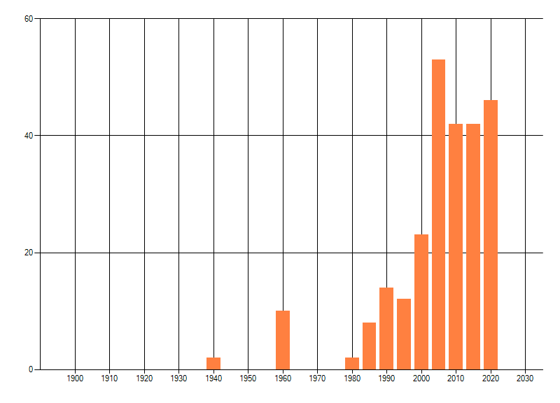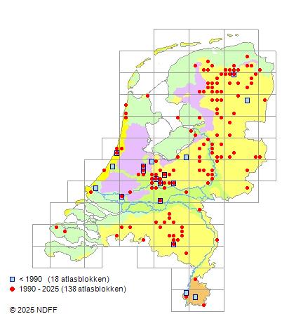 Het aantal atlasblokken (5x5 km) waarin de soort is gemeld binnen een periode van vijf jaar (vanaf 1980) of twintig jaar. Niet gecorrigeerd voor waarnemersinspanning en het aantal doorgegeven waarnemingen kan sterk variëren per periode, dus een trend in verspreiding kan hier niet direct uit worden afgelezen. Het opgegeven jaartal is het eerste jaar van de periode. Bron: gevalideerde waarnemingen uit de NDFF.