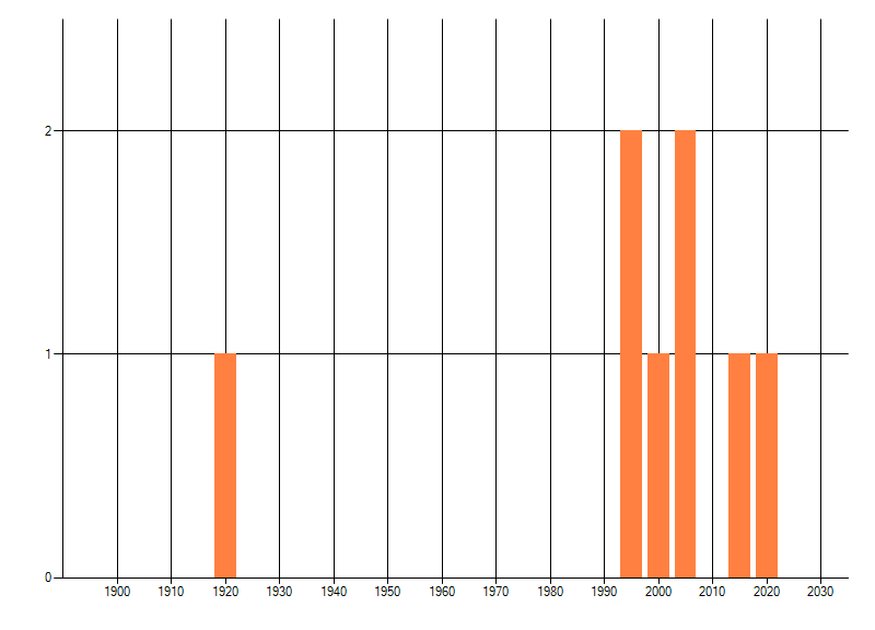 Het aantal atlasblokken (5x5 km) waarin de soort is gemeld binnen een periode van vijf jaar (vanaf 1980) of twintig jaar. Niet gecorrigeerd voor waarnemersinspanning en het aantal doorgegeven waarnemingen kan sterk variëren per periode, dus een trend in verspreiding kan hier niet direct uit worden afgelezen. Het opgegeven jaartal is het eerste jaar van de periode. Bron: gevalideerde waarnemingen uit de NDFF.