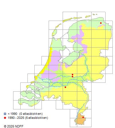Het aantal atlasblokken (5x5 km) waarin de soort is gemeld binnen een periode van vijf jaar (vanaf 1980) of twintig jaar. Niet gecorrigeerd voor waarnemersinspanning en het aantal doorgegeven waarnemingen kan sterk variëren per periode, dus een trend in verspreiding kan hier niet direct uit worden afgelezen. Het opgegeven jaartal is het eerste jaar van de periode. Bron: gevalideerde waarnemingen uit de NDFF.