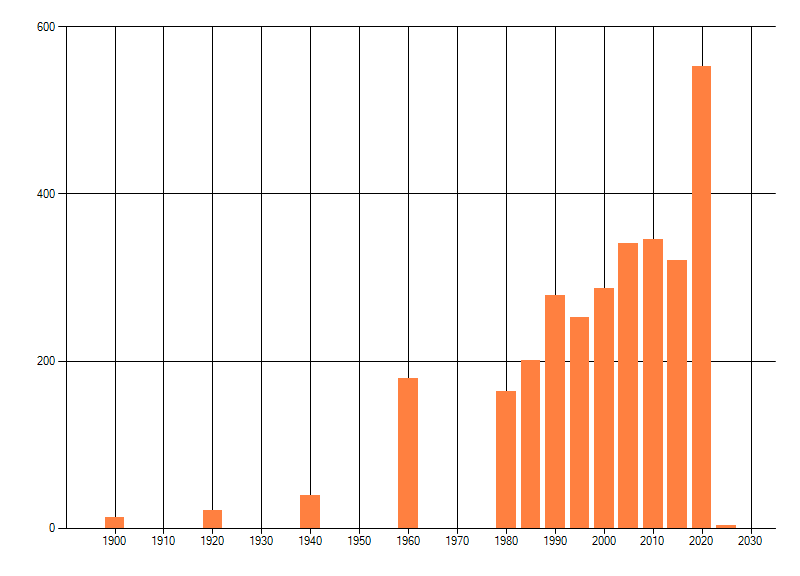 Het aantal atlasblokken (5x5 km) waarin de soort is gemeld binnen een periode van vijf jaar (vanaf 1980) of twintig jaar. Niet gecorrigeerd voor waarnemersinspanning en het aantal doorgegeven waarnemingen kan sterk variëren per periode, dus een trend in verspreiding kan hier niet direct uit worden afgelezen. Het opgegeven jaartal is het eerste jaar van de periode. Bron: gevalideerde waarnemingen uit de NDFF.