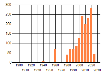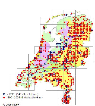 Het aantal atlasblokken (5x5 km) waarin de soort is gemeld binnen een periode van vijf jaar (vanaf 1980) of twintig jaar. Niet gecorrigeerd voor waarnemersinspanning en het aantal doorgegeven waarnemingen kan sterk variëren per periode, dus een trend in verspreiding kan hier niet direct uit worden afgelezen. Het opgegeven jaartal is het eerste jaar van de periode. Bron: gevalideerde waarnemingen uit de NDFF.