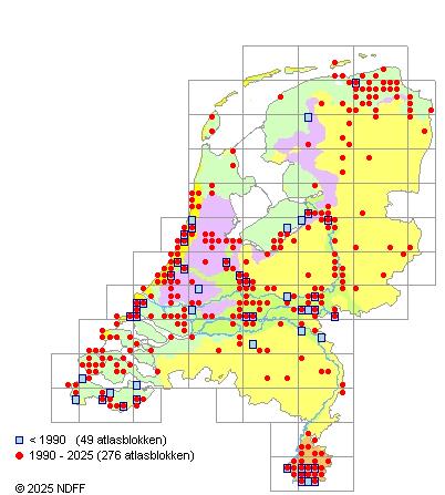 Het aantal atlasblokken (5x5 km) waarin de soort is gemeld binnen een periode van vijf jaar (vanaf 1980) of twintig jaar. Niet gecorrigeerd voor waarnemersinspanning en het aantal doorgegeven waarnemingen kan sterk variëren per periode, dus een trend in verspreiding kan hier niet direct uit worden afgelezen. Het opgegeven jaartal is het eerste jaar van de periode. Bron: gevalideerde waarnemingen uit de NDFF.
