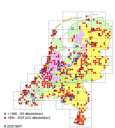 Het aantal atlasblokken (5x5 km) waarin de soort is gemeld binnen een periode van vijf jaar (vanaf 1980) of twintig jaar. Niet gecorrigeerd voor waarnemersinspanning en het aantal doorgegeven waarnemingen kan sterk variëren per periode, dus een trend in verspreiding kan hier niet direct uit worden afgelezen. Het opgegeven jaartal is het eerste jaar van de periode. Bron: gevalideerde waarnemingen uit de NDFF.