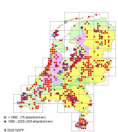 Het aantal atlasblokken (5x5 km) waarin de soort is gemeld binnen een periode van vijf jaar (vanaf 1980) of twintig jaar. Niet gecorrigeerd voor waarnemersinspanning en het aantal doorgegeven waarnemingen kan sterk variëren per periode, dus een trend in verspreiding kan hier niet direct uit worden afgelezen. Het opgegeven jaartal is het eerste jaar van de periode. Bron: gevalideerde waarnemingen uit de NDFF.