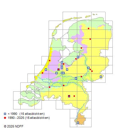 Het aantal atlasblokken (5x5 km) waarin de soort is gemeld binnen een periode van vijf jaar (vanaf 1980) of twintig jaar. Niet gecorrigeerd voor waarnemersinspanning en het aantal doorgegeven waarnemingen kan sterk variëren per periode, dus een trend in verspreiding kan hier niet direct uit worden afgelezen. Het opgegeven jaartal is het eerste jaar van de periode. Bron: gevalideerde waarnemingen uit de NDFF.