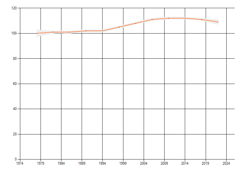 Gemiddelde trend van het aantal kilometerhokken waarin de soort voorkomt, weergegeven als indexcijfer (1975-1978 = 100).