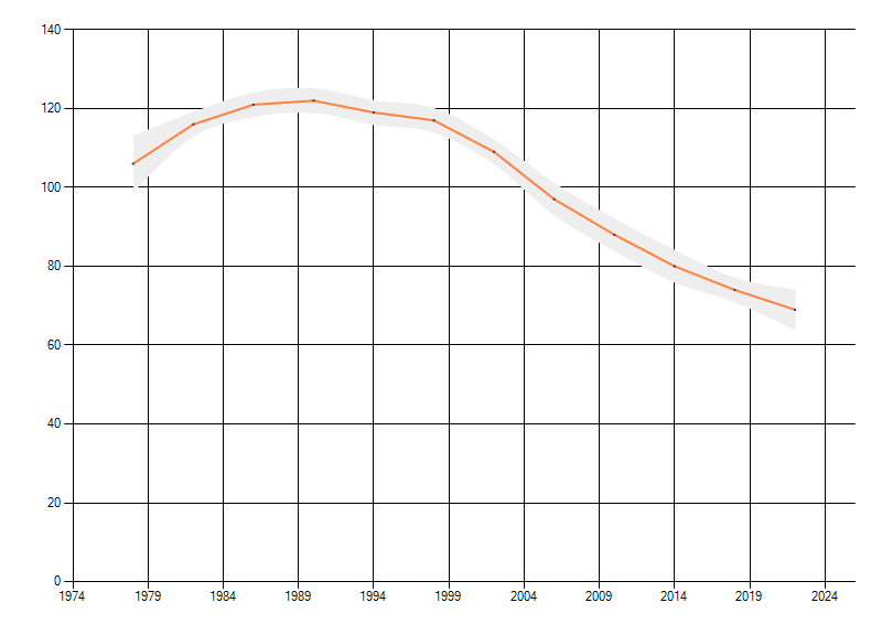 Gemiddelde trend van het aantal kilometerhokken waarin de soort voorkomt, weergegeven als indexcijfer (1975-1978 = 100).