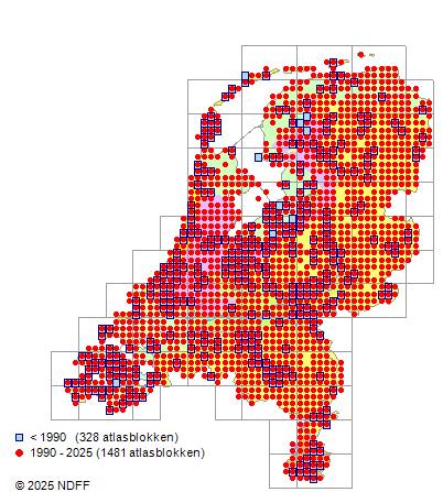Het aantal atlasblokken (5x5 km) waarin de soort is gemeld binnen een periode van vijf jaar (vanaf 1980) of twintig jaar. Niet gecorrigeerd voor waarnemersinspanning en het aantal doorgegeven waarnemingen kan sterk variëren per periode, dus een trend in verspreiding kan hier niet direct uit worden afgelezen. Het opgegeven jaartal is het eerste jaar van de periode. Bron: gevalideerde waarnemingen uit de NDFF.