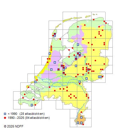 Het aantal atlasblokken (5x5 km) waarin de soort is gemeld binnen een periode van vijf jaar (vanaf 1980) of twintig jaar. Niet gecorrigeerd voor waarnemersinspanning en het aantal doorgegeven waarnemingen kan sterk variëren per periode, dus een trend in verspreiding kan hier niet direct uit worden afgelezen. Het opgegeven jaartal is het eerste jaar van de periode. Bron: gevalideerde waarnemingen uit de NDFF.