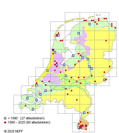 Het aantal atlasblokken (5x5 km) waarin de soort is gemeld binnen een periode van vijf jaar (vanaf 1980) of twintig jaar. Niet gecorrigeerd voor waarnemersinspanning en het aantal doorgegeven waarnemingen kan sterk variëren per periode, dus een trend in verspreiding kan hier niet direct uit worden afgelezen. Het opgegeven jaartal is het eerste jaar van de periode. Bron: gevalideerde waarnemingen uit de NDFF.