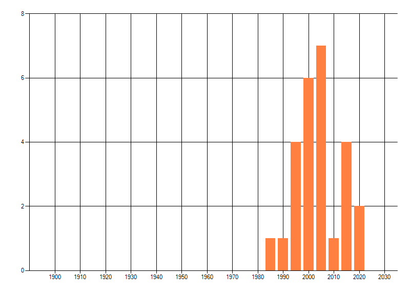 Het aantal atlasblokken (5x5 km) waarin de soort is gemeld binnen een periode van vijf jaar (vanaf 1980) of twintig jaar. Niet gecorrigeerd voor waarnemersinspanning en het aantal doorgegeven waarnemingen kan sterk variëren per periode, dus een trend in verspreiding kan hier niet direct uit worden afgelezen. Het opgegeven jaartal is het eerste jaar van de periode. Bron: gevalideerde waarnemingen uit de NDFF.